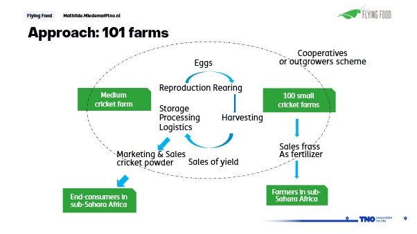 A few local farmers asked TNO to develop a scaling strategy. TNO in collaboration with our local trainers developed a model for medium-sized cricket farms linked to 100 small holder cricket farmers. The mid-size farm trains and provides eggs to the small holder farmers, they will breed the crickets to adults and will sell their yield to the medium farm for processing and sales. This ‘101-farm’ delivers 63 million eggs and 21 tons of fresh crickets annually. This 101-farm can act as cooperative or handling an out grower model / contract farming.